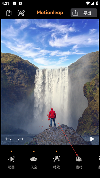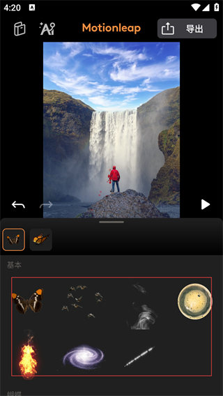 1、在【Motionleap】编辑界面,点击底部【素材】选项,展开素材库(含蝴蝶、飞鸟等动态元素)。