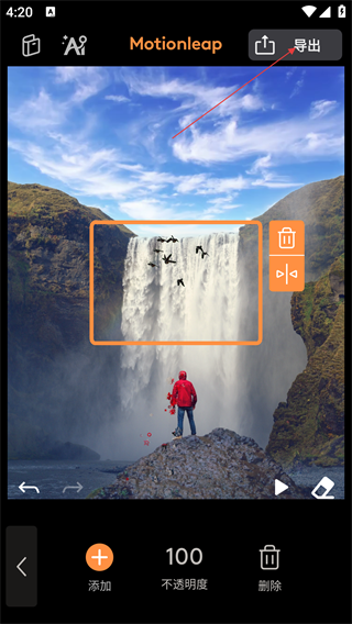 2、选择目标素材(如飞鸟元素),添加到图片中,调整其位置、不透明度等参数(如图中瀑布区域的飞鸟素材)。