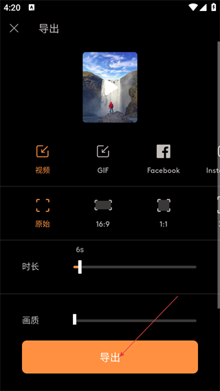 4、选择导出格式(如视频)、比例(如原始),确认时长、画质参数后,点击【导出】完成作品保存。