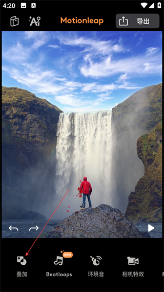 1、在【Motionleap】编辑界面,点击底部【叠加】选项,展开叠加效果素材库(含粒子、氛围等效果)。