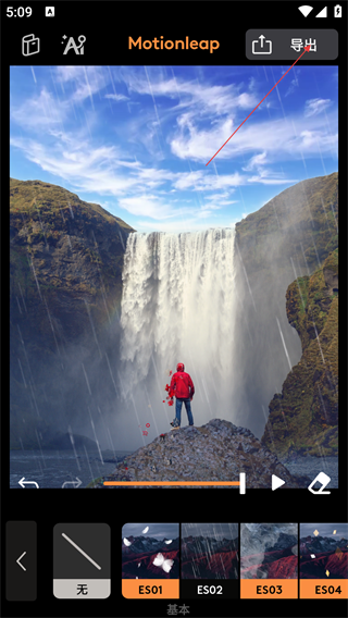 2、选择目标叠加效果(如“ES02”),应用到图片中,调整效果的覆盖范围与强度(如图中瀑布场景的雨雾叠加效果)。