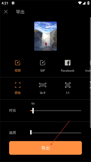 4、选择导出格式(如视频)、比例(如原始),确认时长、画质参数后,点击【导出】完成作品保存。