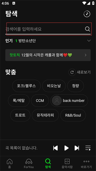 2、进入搜索页可在【검색어를-입력하세요】搜索框输关键词,也可通过【인기-1-랭킹소년단】【맛춤】分类快速找音乐。