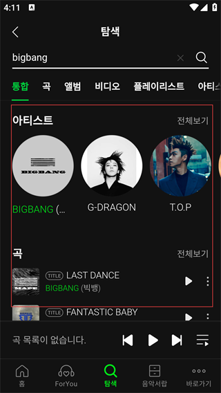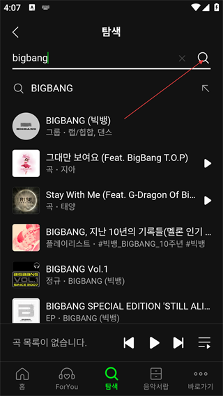 3、搜索【bigbang】后,可直接点击关联的【BIGBANG】歌手名或【그대만-보여요-(Feat.-BigBang-T.O.P)】歌曲播放。