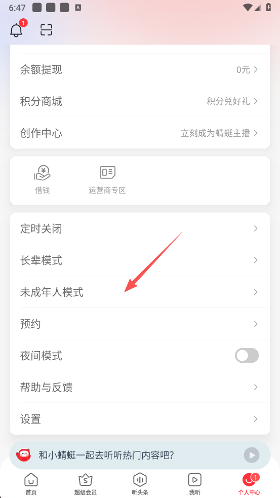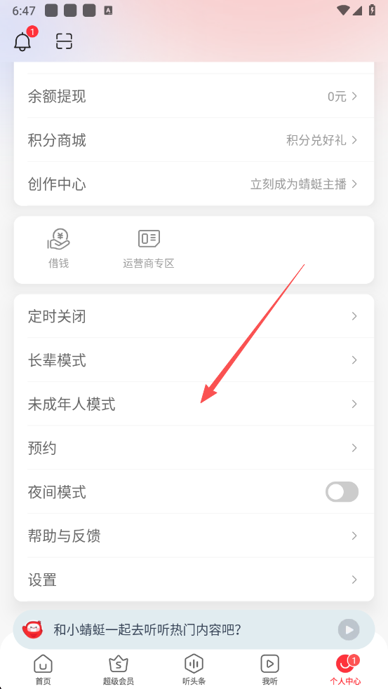 2、在个人中心页面找到【未成年人模式】选项,点击进入未成年人模式设置页面。