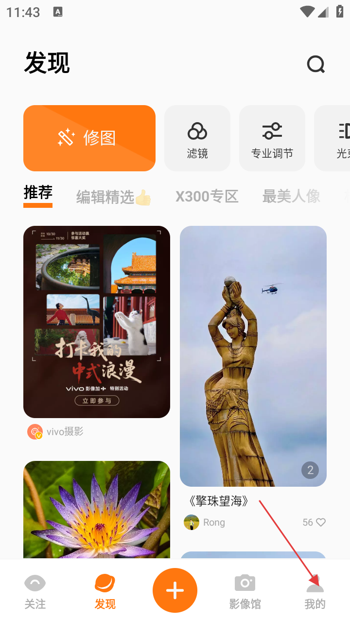 1、在vivo摄影APP“发现”界面,点击右下角【我的】按钮,进入个人中心,可查看登录入口等界面。
