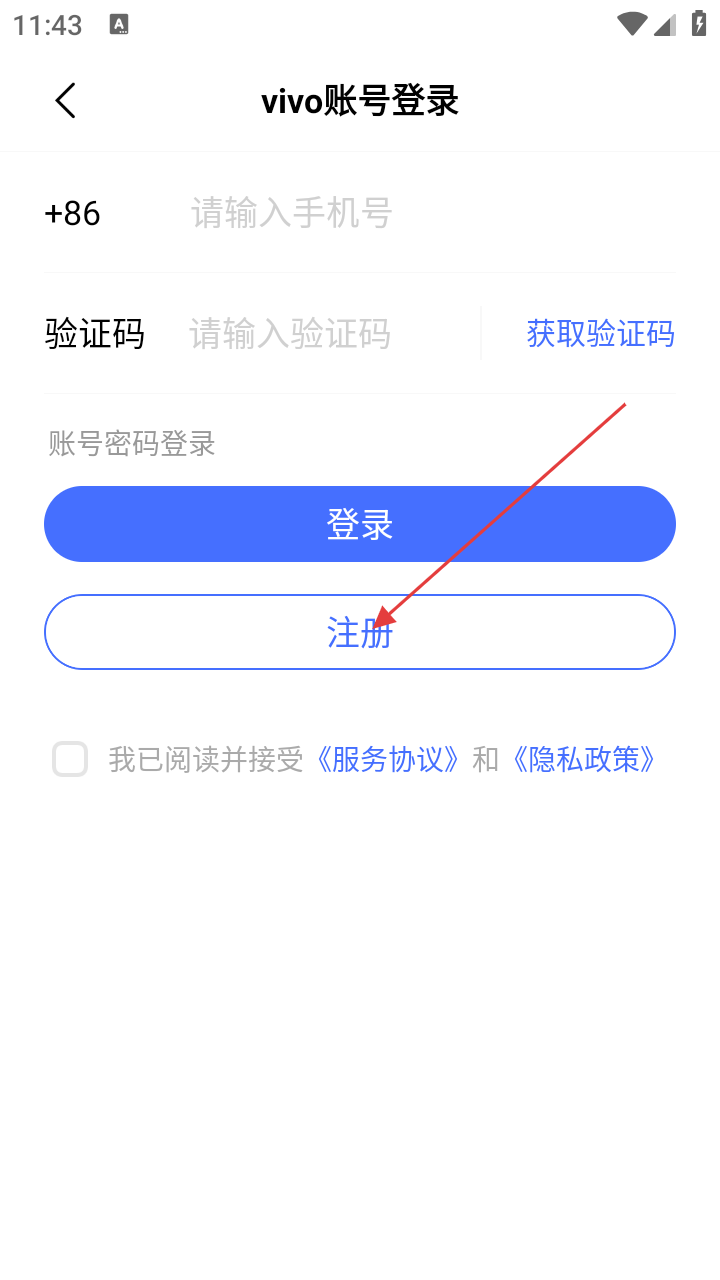 3、在vivo账号登录界面中,点击【注册】选项,进入账号注册界面,需输入手机号并同意相关协议。