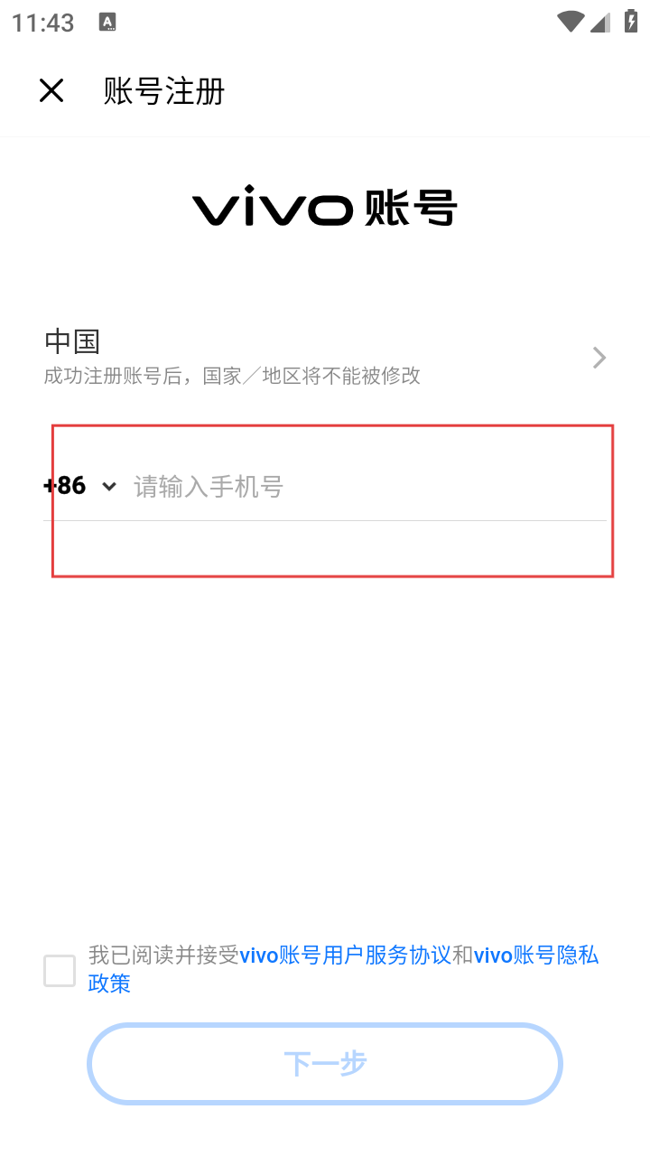 4、在账号注册界面中,输入手机号,点击【下一步】按钮,按照提示完成后续操作,即可完成vivo账号注册。