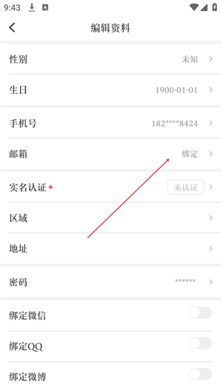 4、在账号设置中,进入【编辑资料】页面,点击【邮箱】即可进入绑定邮箱流程进行操作。