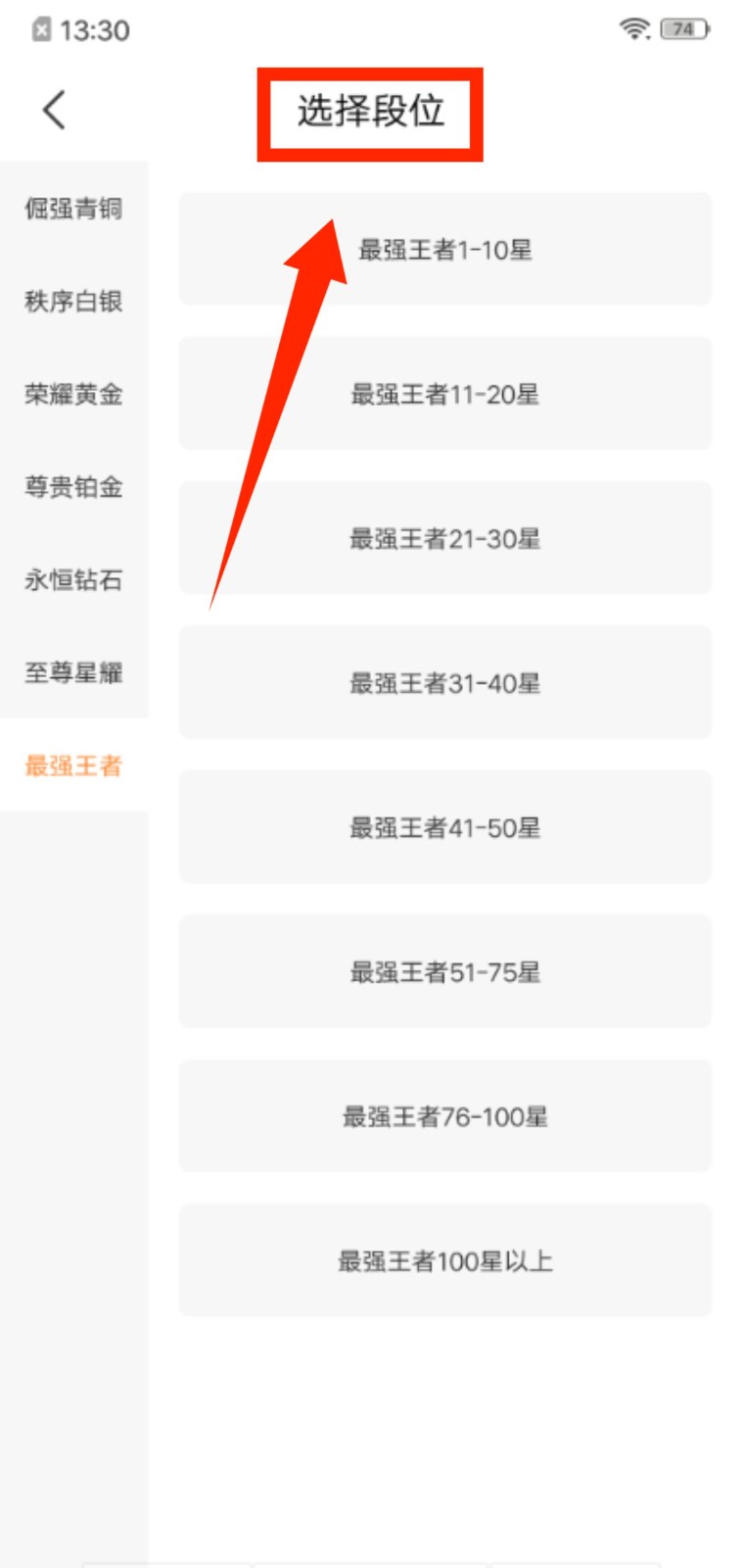 3、进入选择段位页面,根据自身情况选择对应的游戏段位。