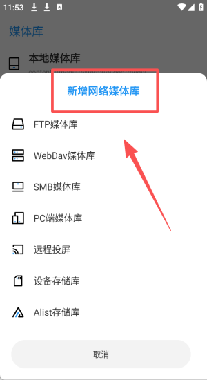 2、点击“+”号按钮,选择“新增网络媒体库”添加新的媒体源。