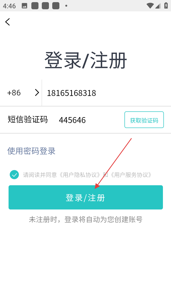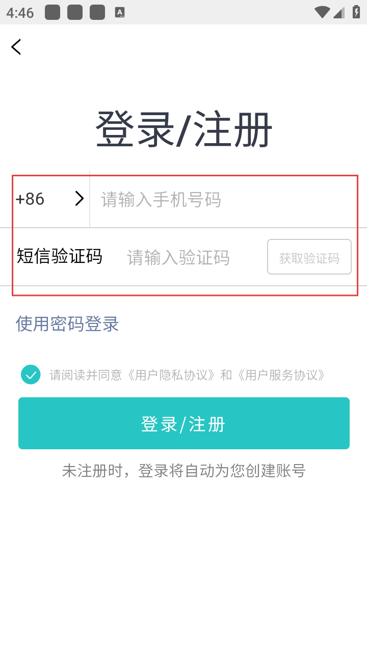 3、在登录/注册界面,输入手机号码,获取并输入短信验证码。