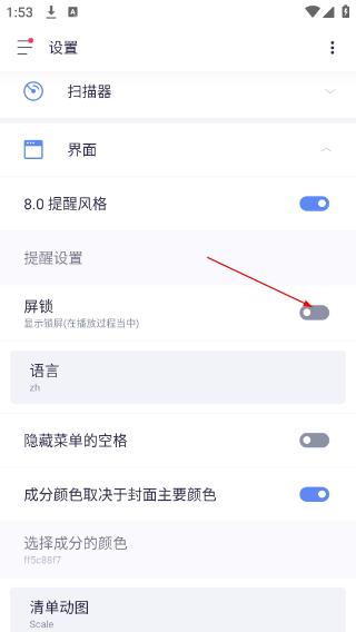 4、将“屏锁”开关切换为开启状态,即可在播放音乐时显示屏锁界面,同时保留“8.0提醒风格”等其他界面功能的配置状态。