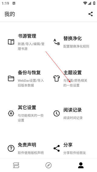 5、进入我的栏目,包括书源管理、替换净化、备份与恢复、主题设置、其他设置、阅读记录等分栏,这里以书源管理为例,教大家如何导入书源,