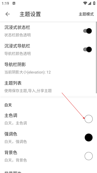 3、在主题设置界面,点击【主色调】选项可进入颜色选择界面。