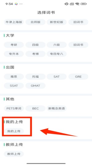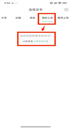 1、进入选择词书页面,找到 “我的上传” 分类并点击,进入对应页面后,可查看上传词书的相关提示。