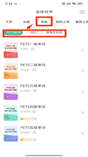 4、切换到 “其他” 分类,选择 “PETS 单词” 标签,下方会展示 PETS 一级到五级的单词书,可按需选择学习。