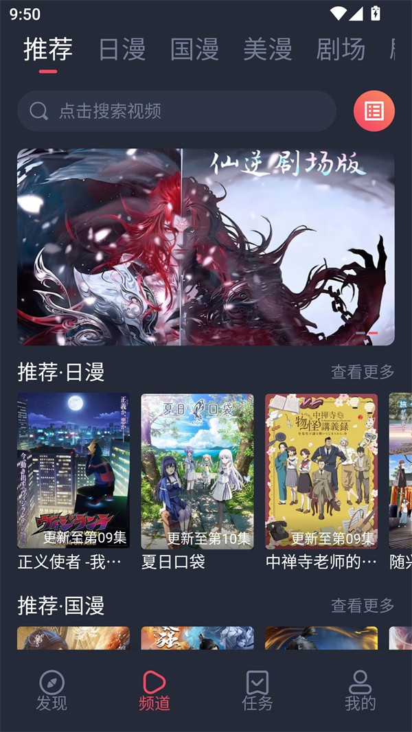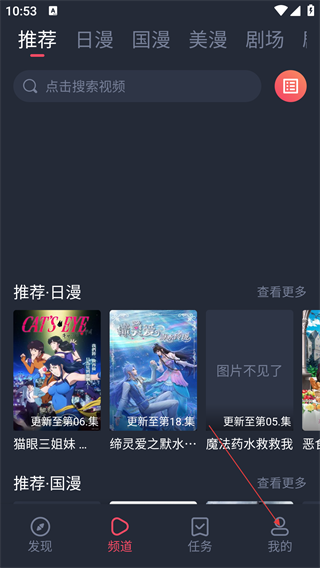 1、打开萌圈动漫进入首页,可在【频道】板块选择【日漫】【国漫】【美漫】【剧场】等分类,点击【我的】进入个人中心。