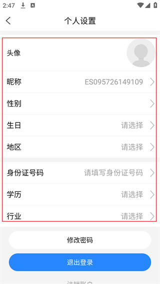 4、在个人设置页面,可对头像、昵称、性别、生日、地区、身份证号码、学历、行业等信息进行编辑完善,完成后即可保存个人信息。