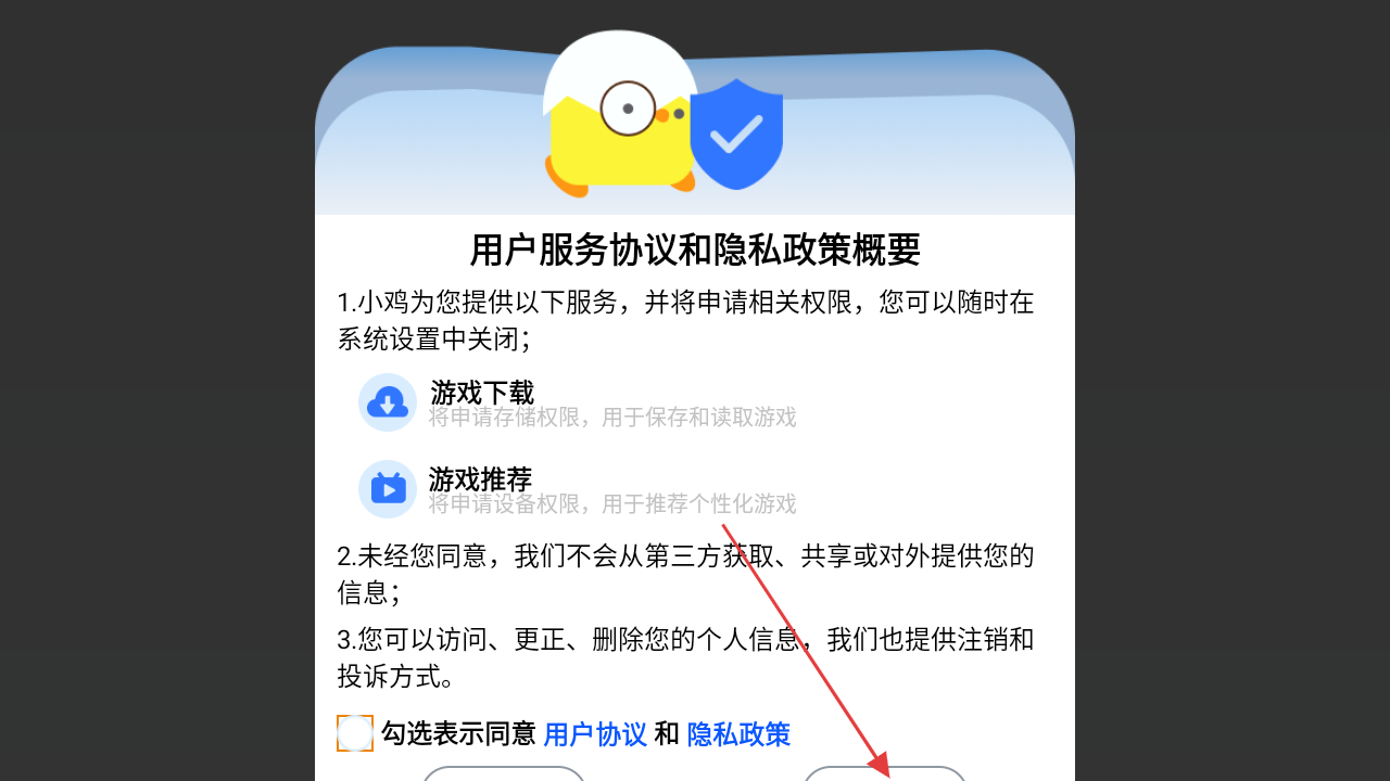 1、在进入小鸡模拟器时,需勾选同意【用户协议】和【隐私政策】,以获取游戏下载、游戏推荐等服务。