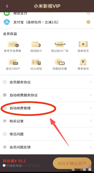 3、在小米影视VIP页面点击“自动续费管理”,查看续费详情。