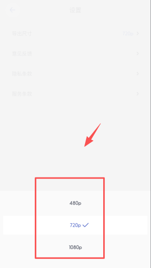3、进入设置页选“导出尺寸”,默认720p可平衡清晰度与文件大小。