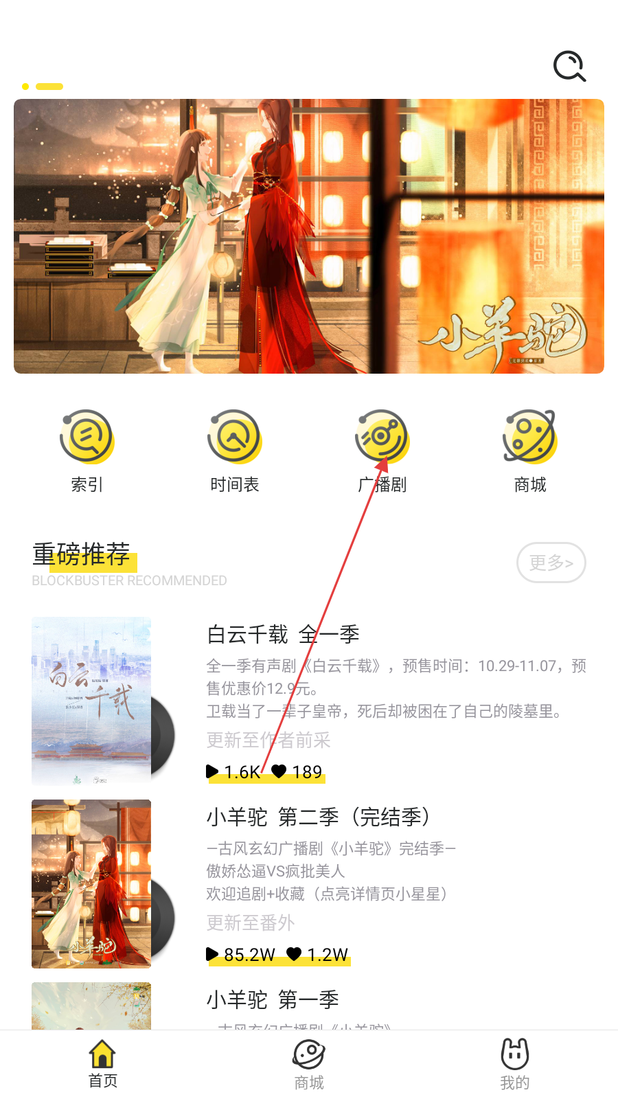 1、在首页点击【广播剧】,进入广播剧索引页面,可查看各类广播剧资源。