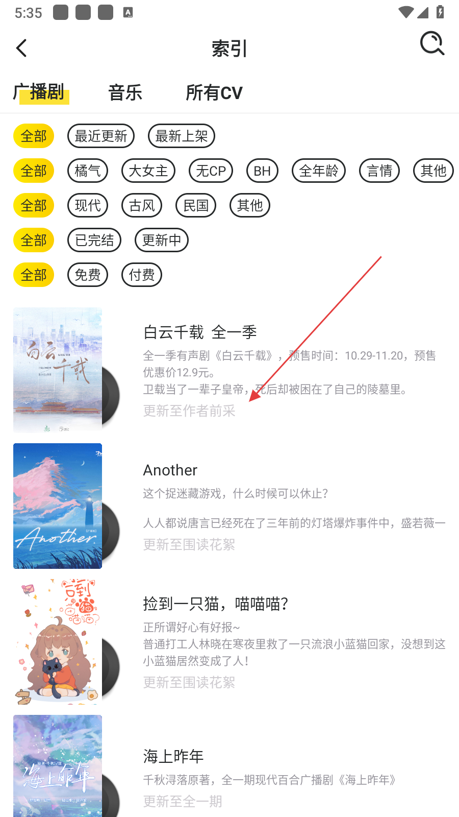 2、在索引页面可通过分类筛选,找到《白云千载全一季》等感兴趣的广播剧。