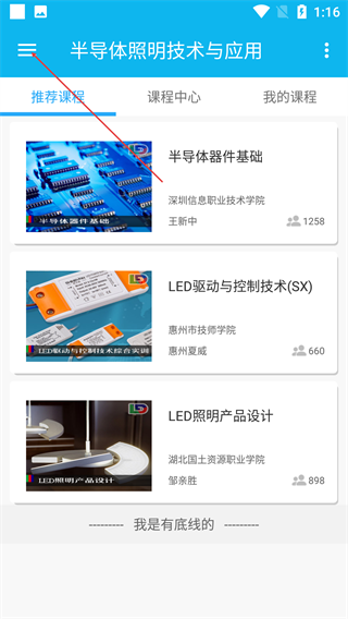 1、在“半导体照明技术与应用”课程页面,点击左上角菜单按钮,展开功能列表。