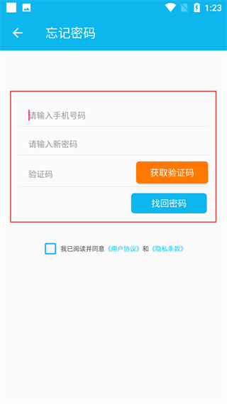 4、在“忘记密码”页面,依次填写绑定的手机号码、设置新密码,点击【获取验证码】并填写,点击【找回密码】,完成密码重置。