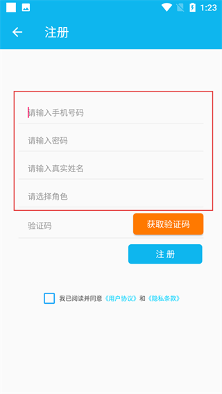 4、在注册页,依次填写手机号码、密码、真实姓名、选择角色,获取并填写验证码,点击【注册】,完成账号注册。