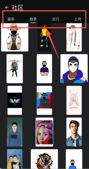 2、切换社区页签点最新趋势,浏览热门作品后点上传按钮准备分享自己创作。