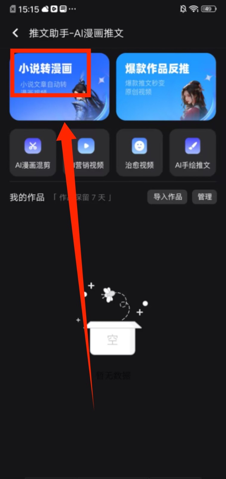 2、进入 AI 漫画推文界面,选择 “小说转漫画” 功能,进入对应的创作配置页面。