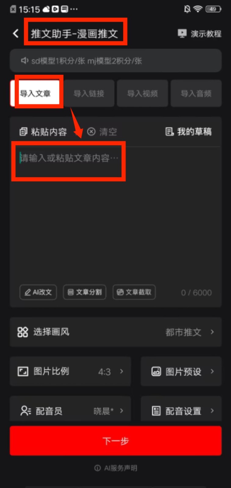 3、在漫画推文编辑页,通过 “导入文章” 功能添加内容,还能设置画风、配音等参数后点 “下一步”。