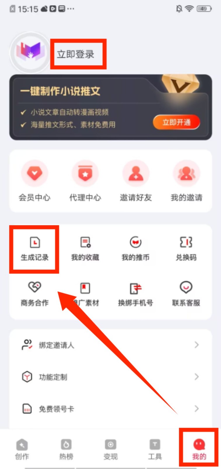 4、点击 “我的” 进入个人页面,完成登录后,可在 “生成记录” 里查看过往创作的内容。