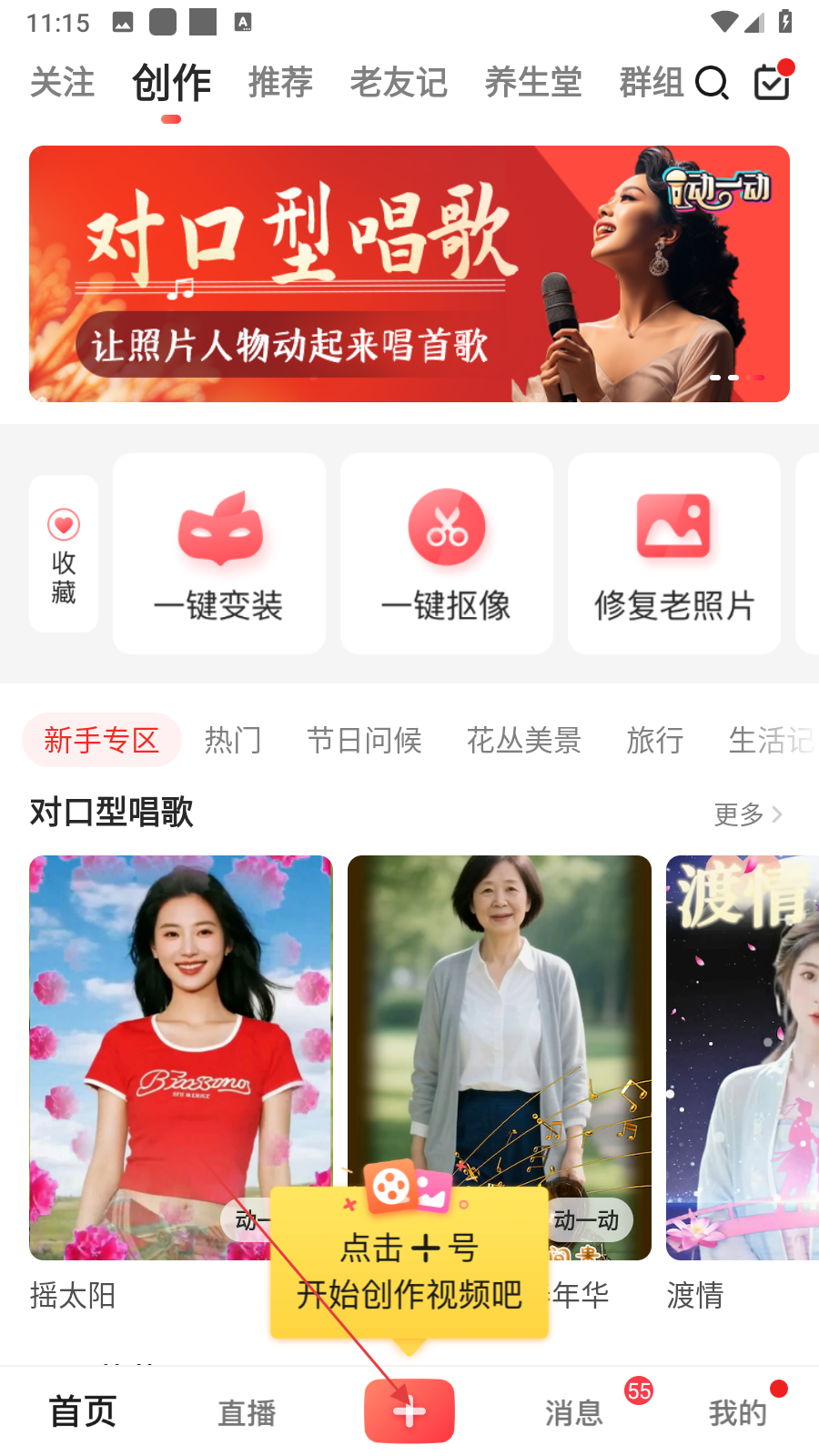 1、打开彩视APP后,进入主界面,点击底部中间的【+】按钮,可进入开始创作界面。