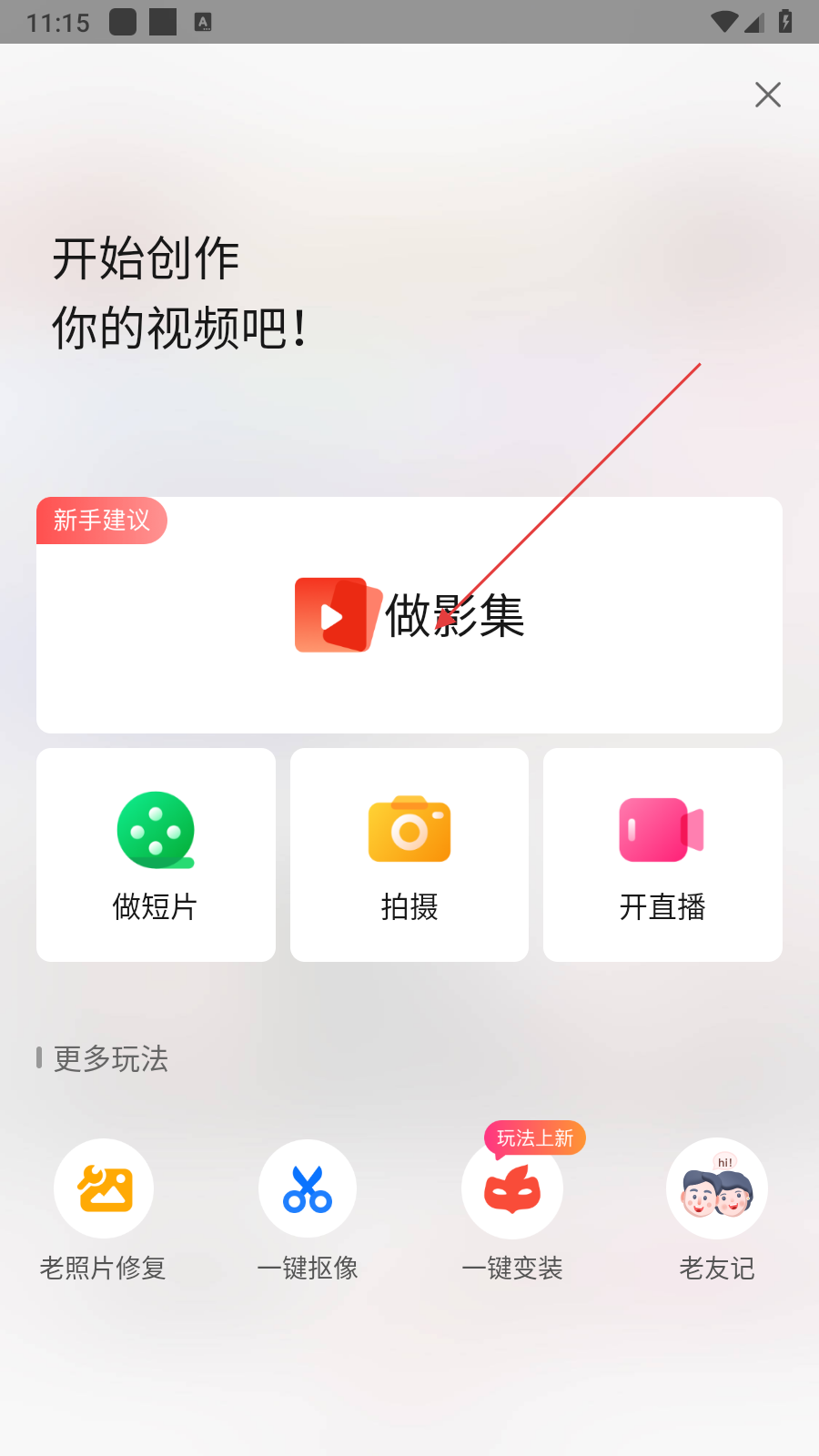 2、在开始创作界面,选择创作类型,例如【做影集】。