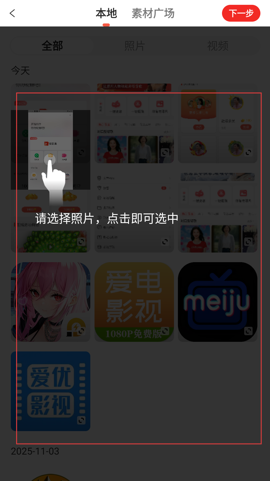 3、进入本地素材选择界面,选择想要制作影集的照片,点击即可选中,选好后点击【下一步】。