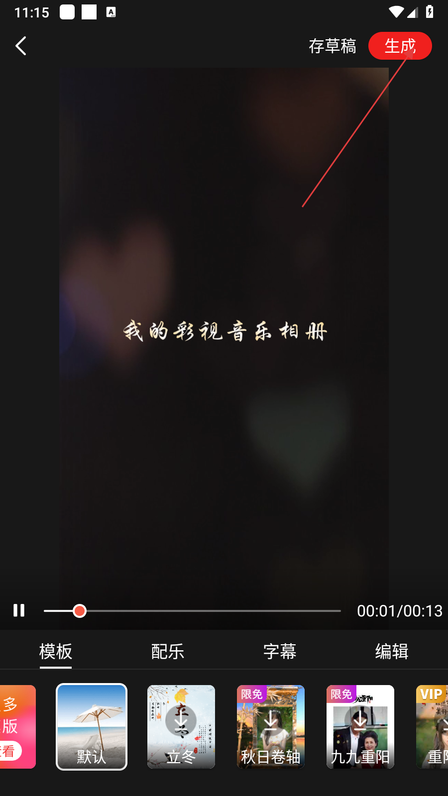 4、进入影集编辑界面,可选择模板、配乐、字幕、编辑等进行个性化设置,设置完成后点击【生成】,即可完成影集制作。
