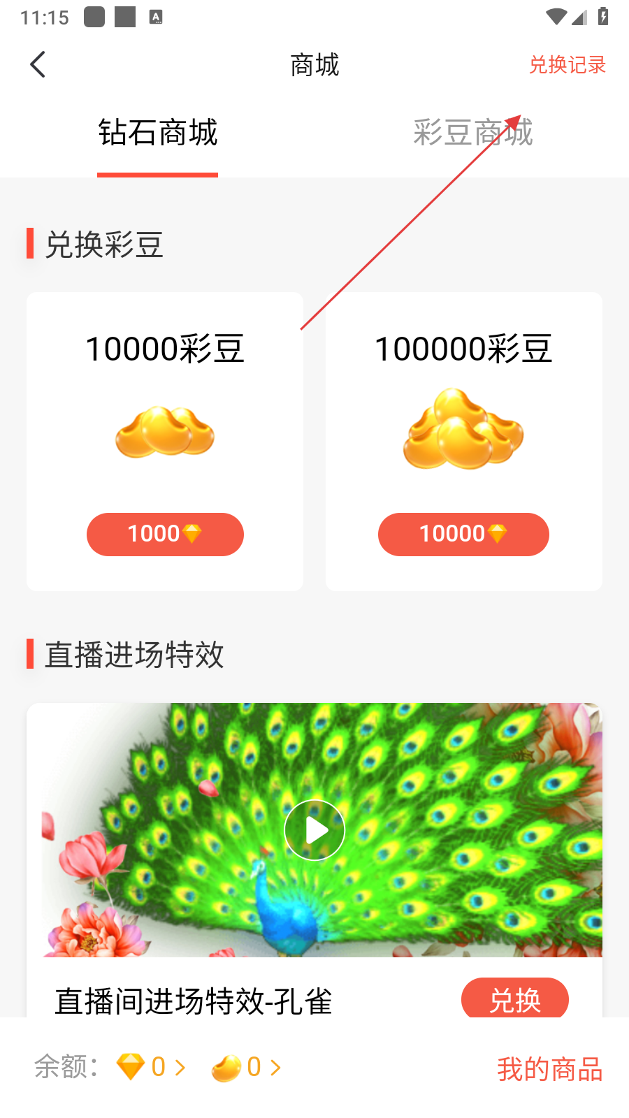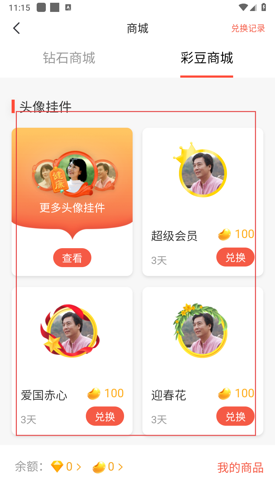 3、在商城界面,可选择【钻石商城】或【彩豆商城】,点击【彩豆商城】可查看彩豆可兑换的商品,如头像挂件等。