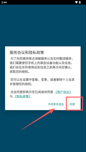 1、阅读协议后点击“同意”,授权使用设备功能以提供讲解与翻译服务。
