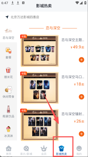 3、在影片/影城页面,点击“影城热卖”。查看影城提供的商品,选择你想要购买的商品。