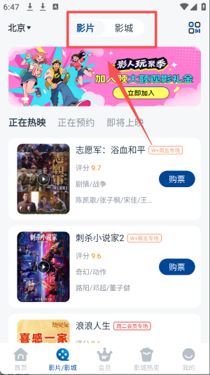 2、在首页,点击“影片/影城”标签。选择“影片”或“影城”来浏览电影或影院信息。