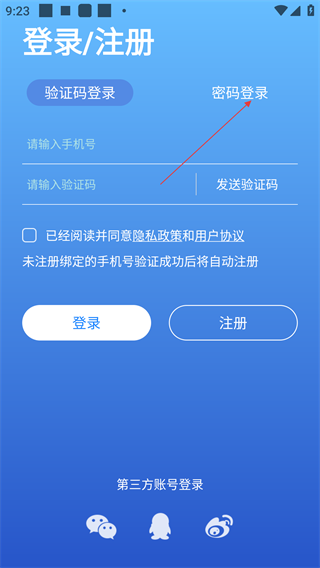 2、进入【登录/注册】页,默认是【验证码登录】模式,也可点击【密码登录】切换至密码验证方式,按需选择登录途径。
