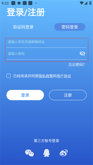 3、切换到【密码登录】后,需在对应输入框填写【手机号或邮箱地址】与【密码】。