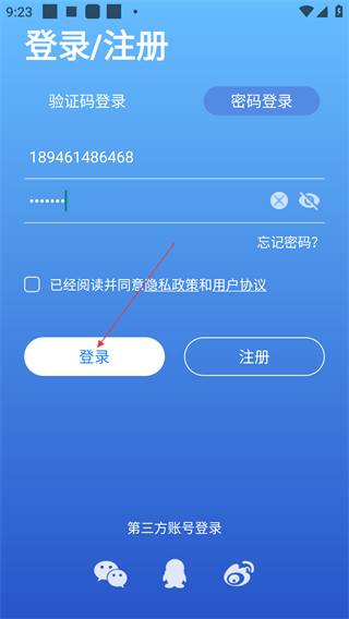 4、在【密码登录】页填入【手机号】和对应密码,勾选协议后点击【登录】按钮,即可完成账号登录操作。