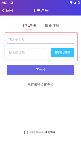 4、在用户注册页面选择手机注册,输入手机号和验证码,勾选同意协议后点击【下一步】,完成账号注册操作。