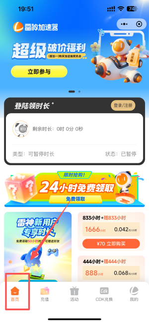 3、点“登录/注册”领取0元24小时时长,剩余0时0分状态变为可暂停计时。