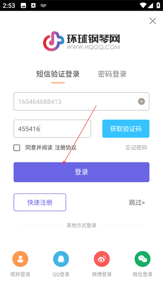 3、在登录页面选择短信验证登录,输入手机号和验证码。