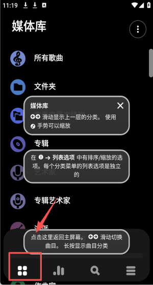 2、在媒体库页面,你可以看到在列表选项中有排序/缩放的选项。其中每个分类菜单的列表选项是独立的。滑动可以显示上一层的分类。使用手势也可以进行缩放操作。